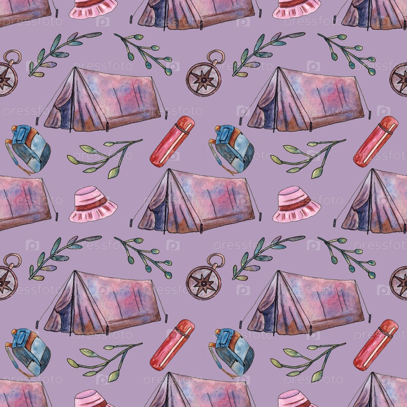 Бесшовный фон с кемпингами. палатка, компас, термос, рюкзак, панамская шляпа и ветви с листьями на фиолетовом фоне. ручной акварель