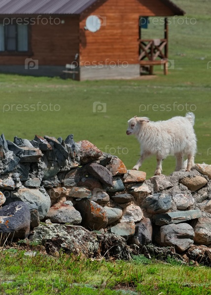 Россия.Западная Сибирь, Алтайские горы.Молодая безгорная коза с белыми волосами идет по каменному забору возле Чуйского тракта