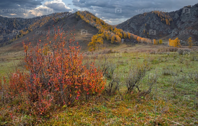 Россия.Западная Сибирь.Кизильник - единственный куст Алтайских гор, чьи листья осенью становятся ярко-красными вдоль Чуйского тракта