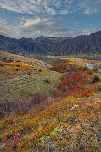 Россия.Западная Сибирь.Кизильник - единственный куст Алтайских гор, чьи листья осенью становятся ярко-красными вдоль Чуйского тракта