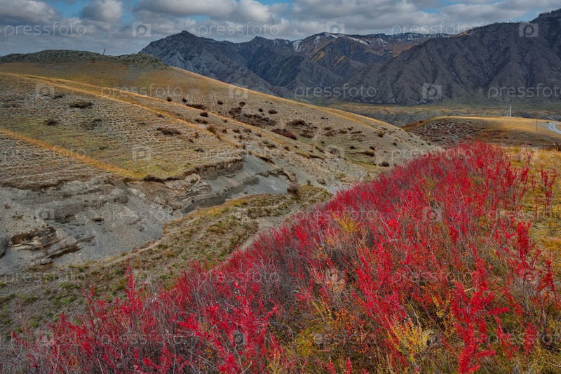 Россия.Западная Сибирь.Кизильник - единственный куст Алтайских гор, чьи листья осенью становятся ярко-красными вдоль Чуйского тракта
