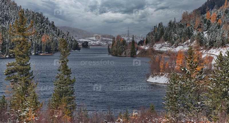 Осенний вид текущего озера на реке Чибитка, высушенного первым снегом