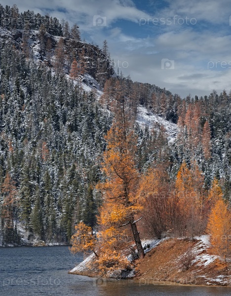Осенний вид текущего озера на реке Чибитка, высушенного первым снегом