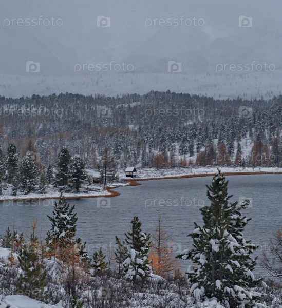 Осенний вид текущего озера на реке Чибитка, высушенного первым снегом