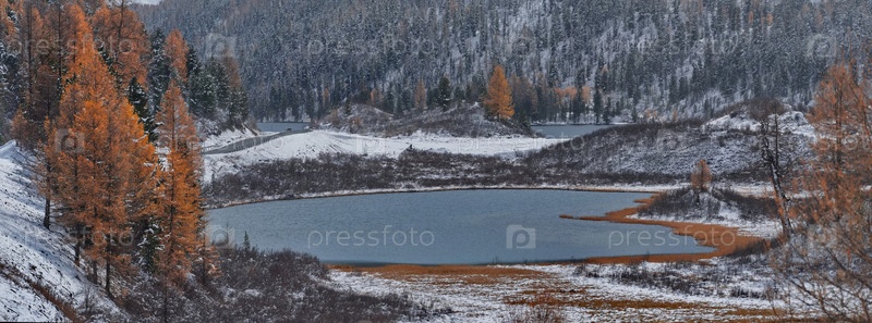 Осенний вид текущего озера на реке Чибитка, высушенного первым снегом