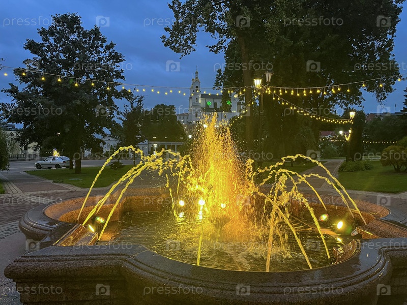 Освещенный фонтан в историческом центре Витебска, Беларусь