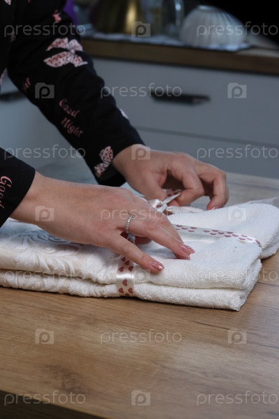 Женщина распаковывает и смотрит на подарочный комплект из двух полотенцев.Два полотенца связаны друг с другом лентой.Женщина развязывает ленту