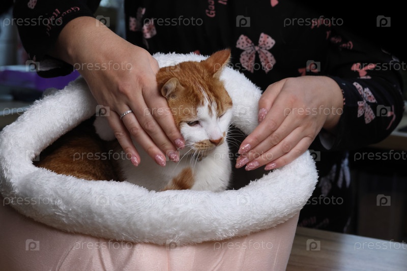 Женщина осматривает кошачий домик.Розовая, изолированная кошачая кровать.Кошка сидит в постели