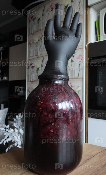Стеклянная банка с ферментированным виноградом. В банку нанесена черная резиновая перчатка. Перчатка раздувается газами брожения. Производство домашнего вина из винограда