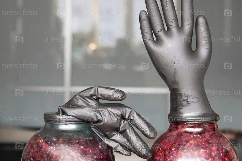 Две стеклянные банки с виноградным брожением. на банки надевают черные резиновые перчатки. одну перчатку раздувают ферментационными газами. делают домашнее виноградное вино. закрытие