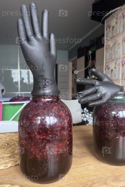 Две стеклянные банки с ферментацией винограда. на банки надеваются черные резиновые перчатки. производство домашнего виноградного вина