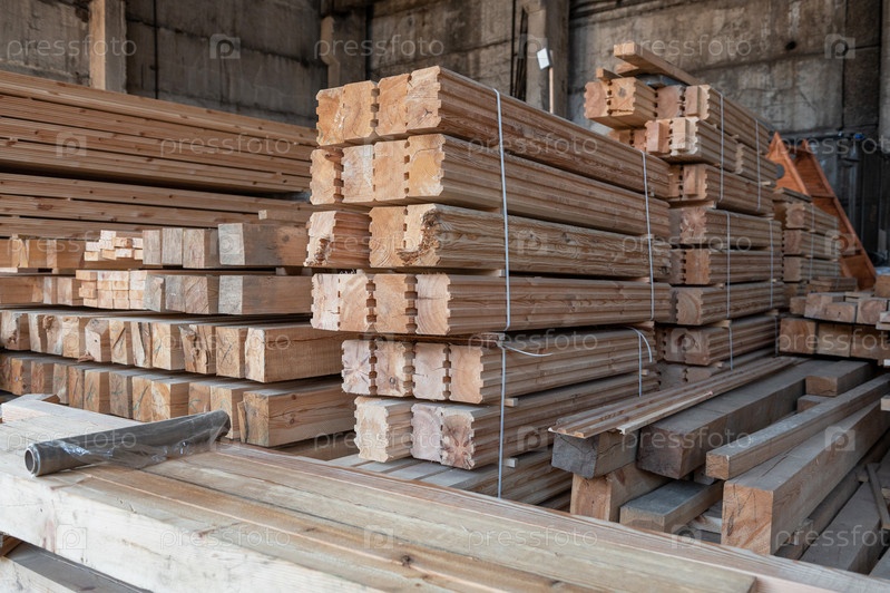 Большие груды деревянных балки и доски, хранящиеся внутри промышленного склада, готовые к строительству, плотничьим или деревообрабатывающим проектам