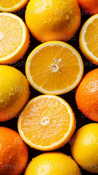 Оранжевые и лимоны в разделе с водяными каплями
