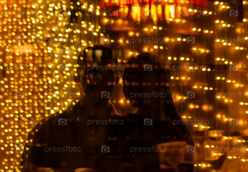 Силуэты пары (мужчины и женщины), отраженные в окне на фоне яркого золотистого боке