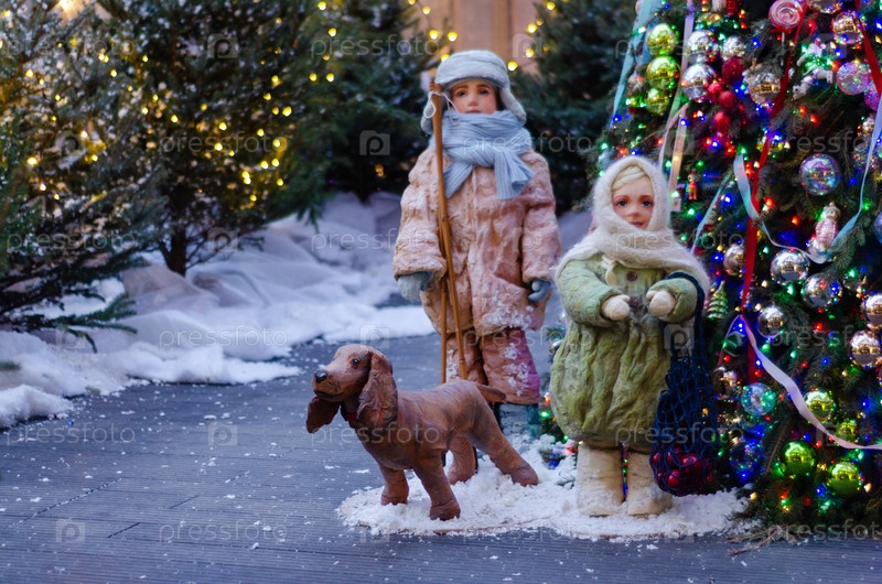 Новогодняя композиция с куклами и декоративной собакой у рождественской елки