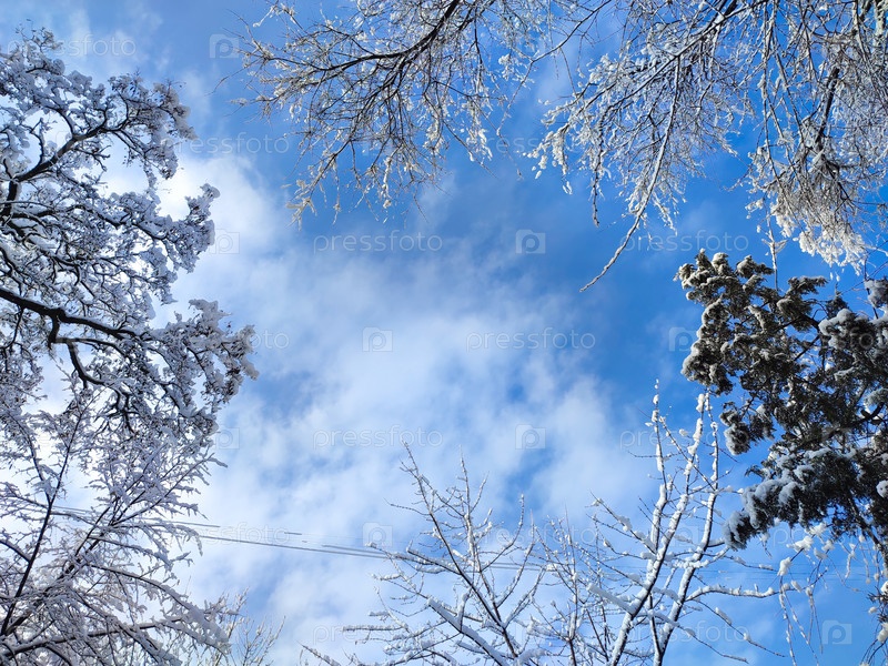 Заснеженные деревья возвышаются над голубым небом