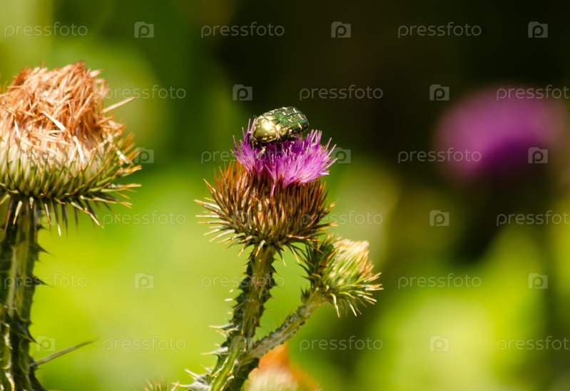 Ближайшее изображение бронзового золотого цвета, Cetonia aurata, сидящего на цветущем осиле с фиолетовыми лепестками