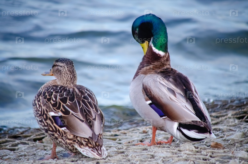 Самки и самцы мальлардов на берегу реки
