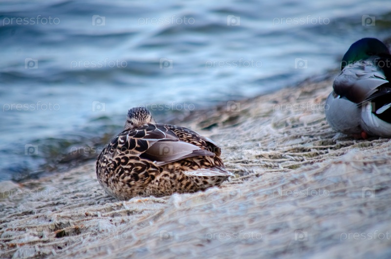 Самки и самцы мальлардов отдыхают на берегу реки