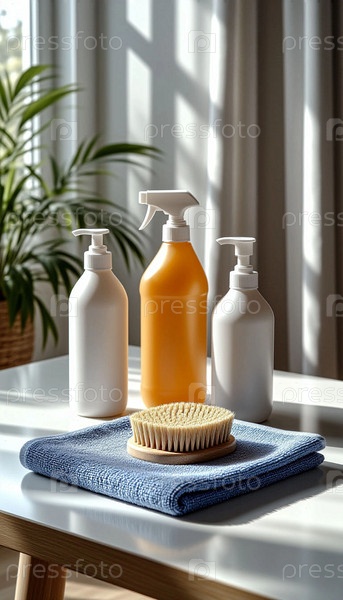 Чистите полотенце и бутылки с бытовыми химикатами для чистоты
