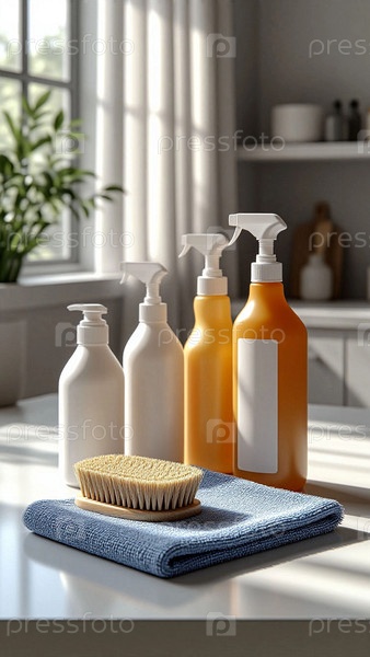 Бутылки с бытовыми химикатами, щетка и полотенце из микроволокна для чистки и чистоты