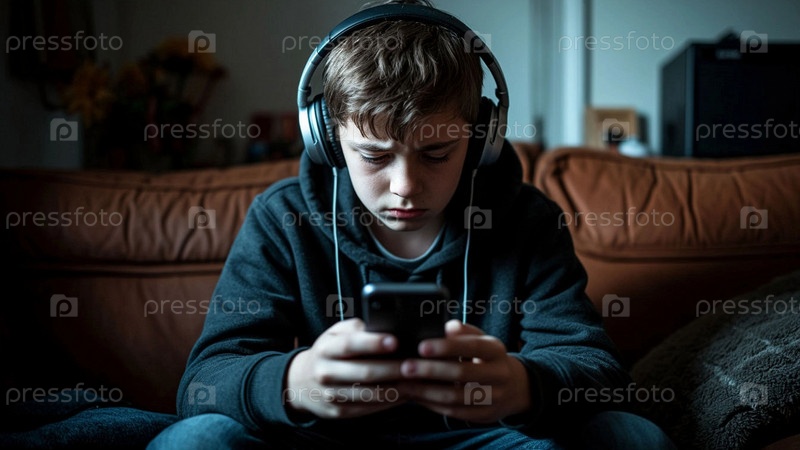 Одинокий расстроенный подросток сидит на диване, надевая наушники с телефоном в руке