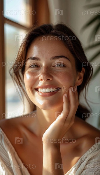 Привлекательная молодая женщина с открытой улыбкой касается ее лица, показывая здоровую и сияющую кожу