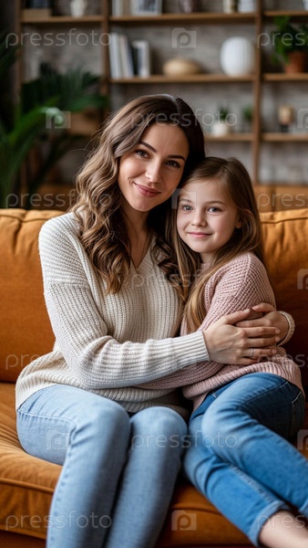 Мама и дочь обнимают друг друга, сидя на диване