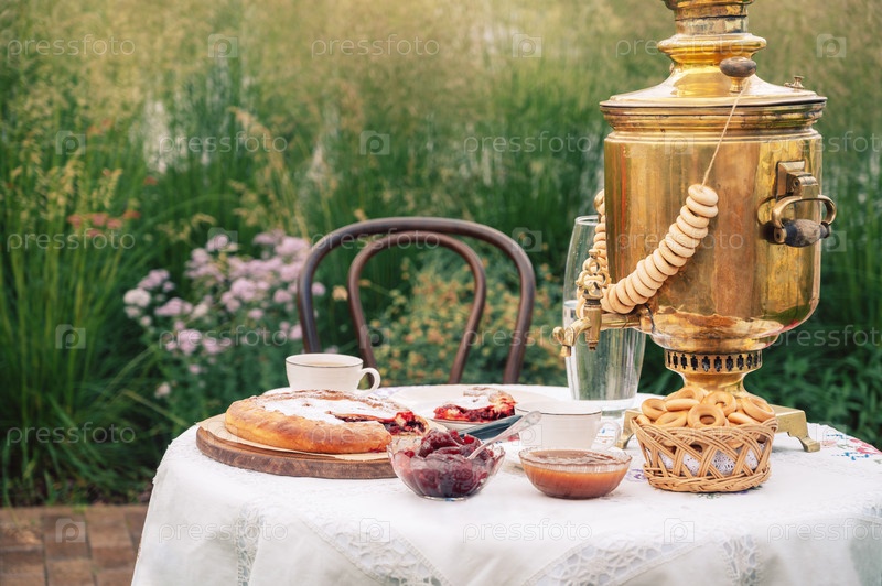 Традиционный чай с самоваром и домашними выпечками на свежем воздухе