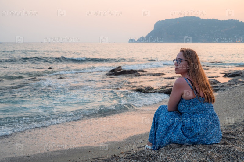Женщина-сидит в море в Городе Алания, Турция.Концепция заражения или расслабления