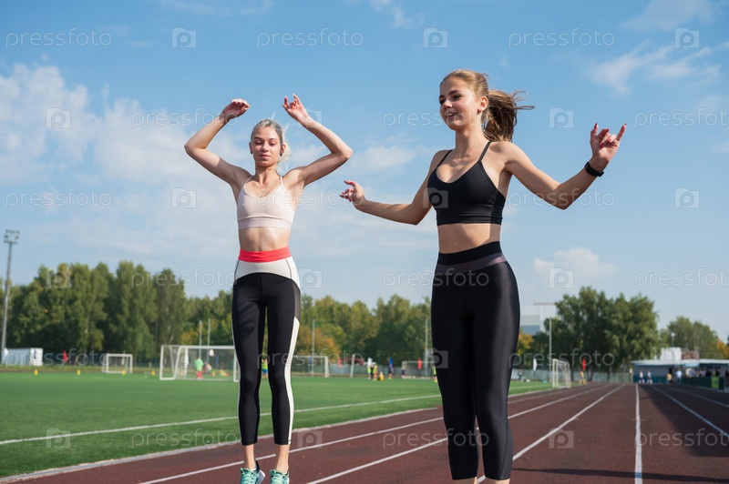 Две подруги - спортсменка молодая женщина бегущий поезд на стадионе под открытым небом