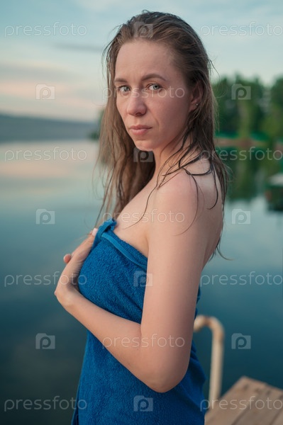 Женщина, завернутая в полотенце и расслабляющаяся у озера на закате