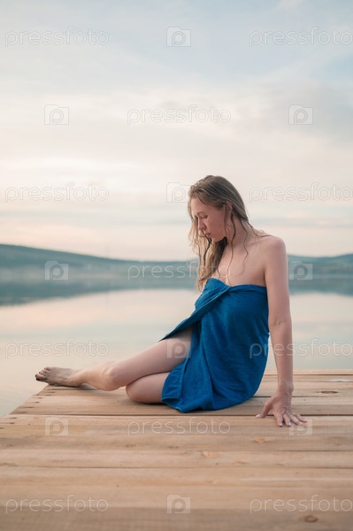 Девушки в гольбоме полотит сидят на скамейке