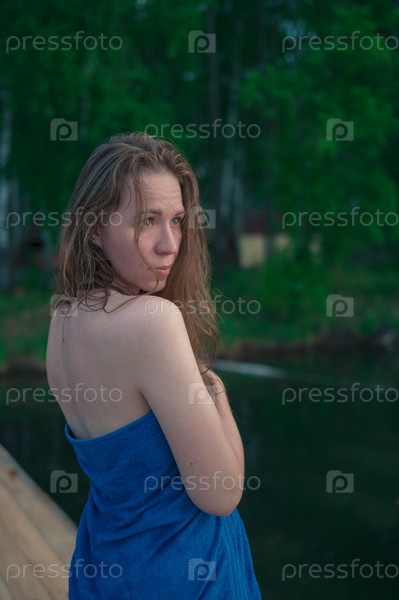 Спокойная женщина стоит у спокойного озера, завернутая в голубое полотенце после купания, наслаждаясь тихим отражением заката солнца и красотой природы