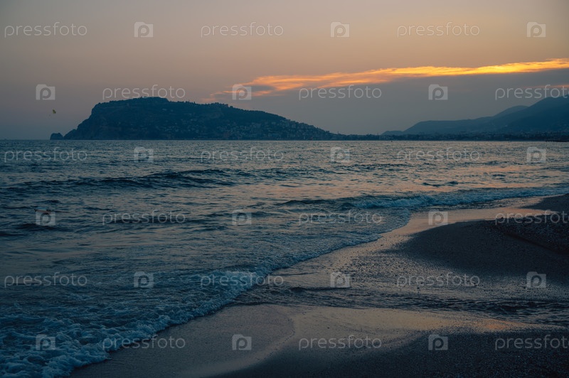 Спокойные волны мягко омывают песчаный пляж на закате с золотым светом заката, отражающимся на воде и отдаленных холмах вдоль береговой линии на Alanya Beach в Турции