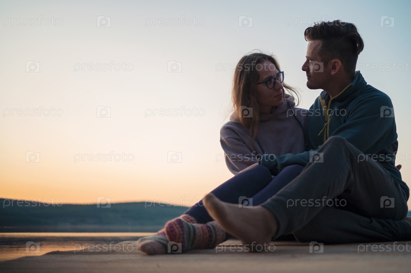 Пара, сидящая у пруда Закате