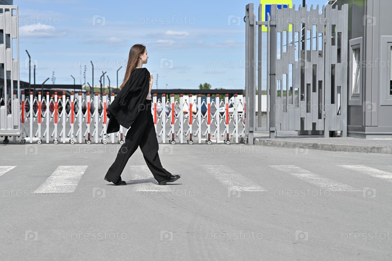 Женщина держит фиолетовую сумку для покупок, стоя снаружи в жилом районе