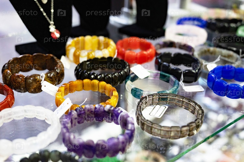Различные браслеты из драгоценных камней, выставленные на стеклянной полке