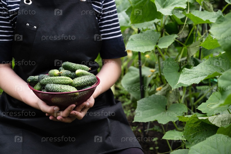 Сбор свежих огурцов в саду в летние месяцы