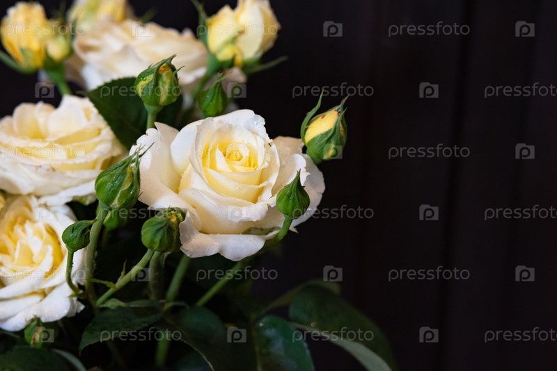 Букет белых роз с мягкими желтыми почками демонстрирует нежные лепестки и пышные зеленые листья, создавая яркий контраст на темном фоне, улучшая их красоту