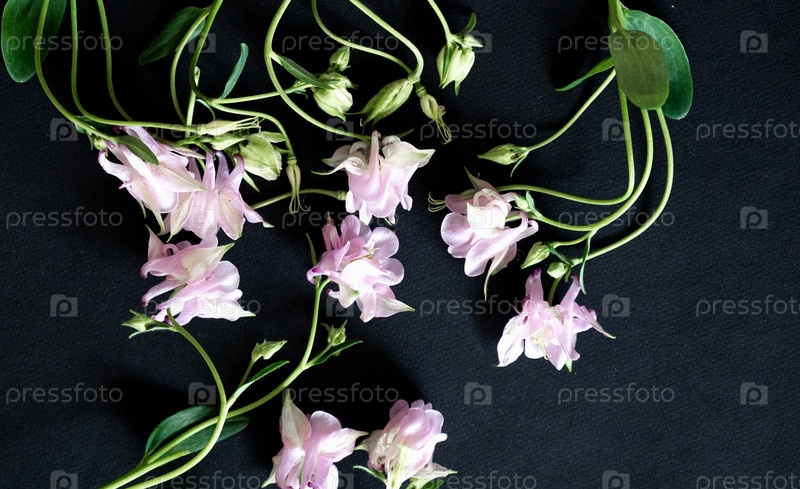 Деликатные фиолетовые и желтые дикие цветы расположены на темной поверхности, показывая свои яркие цвета и сложные узоры.Цветы демонстрируют естественную красоту на контрастном фоне
