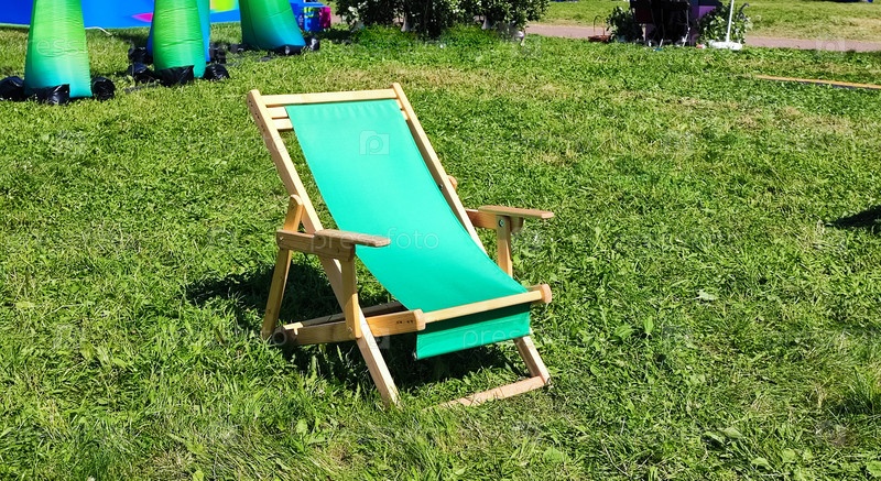 Простая зеленая кресло-комната сидит одна на пышной траве под солнцем, в окружении красочных палаток и ярких декораций, что указывает на праздничное собрание на свежем воздухе