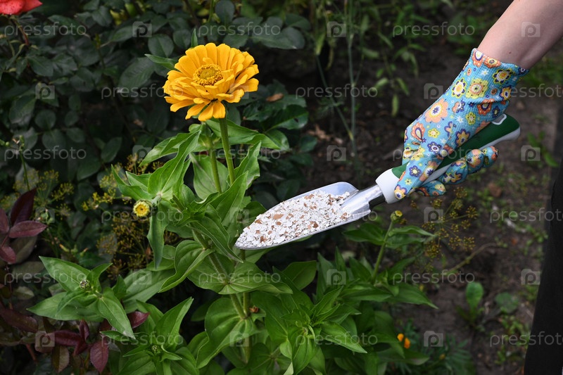 В оживленном саду в начале весны садовник с перчатками использует ложку для нанесения питательных веществ на богатой почве вокруг цветущих апельсиновых роз