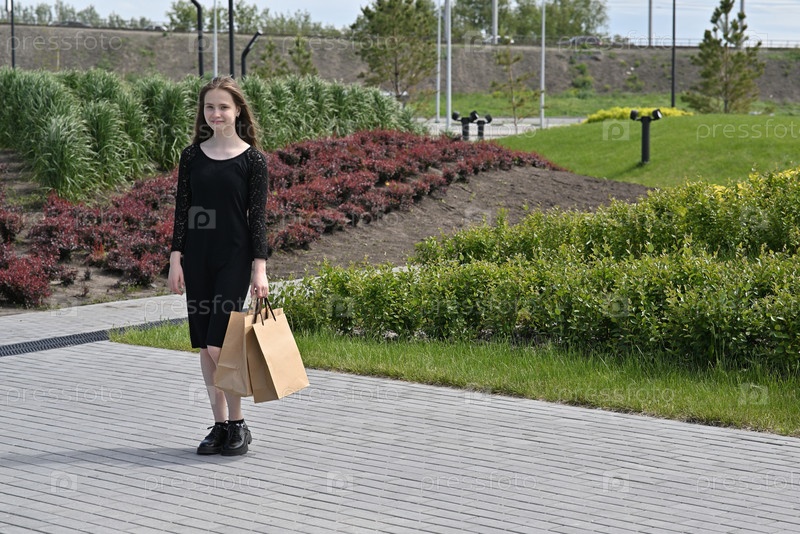 Женщина в черном платье держит сумки с покупками во время прогулки по парку в солнечный день