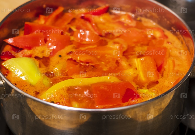 Зеленые и красные капсикумы нарезают на большие ломтики, кипящая в горшке