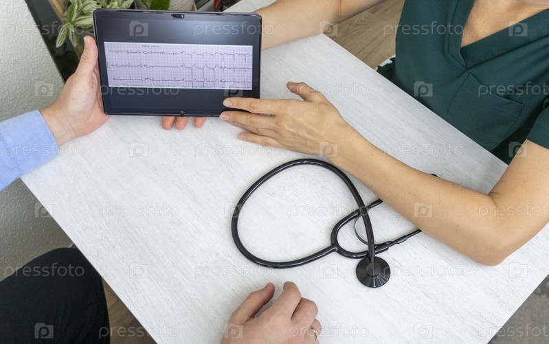Руки женщины-врача в форме, показывающей пациенту кардиограмму на таблетке