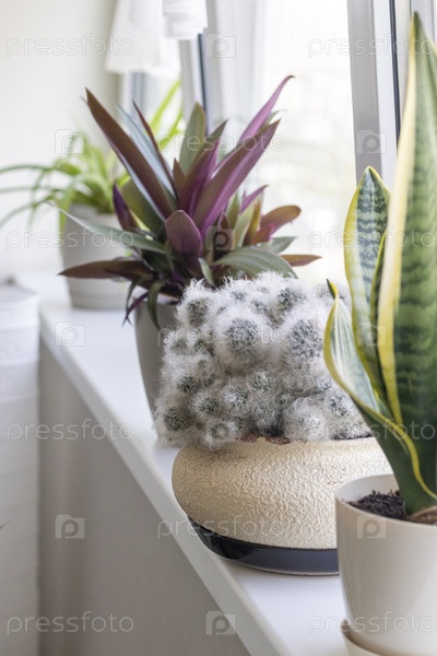 Эстетический снимок домашних горшечных растений на подоконнике современной квартиры