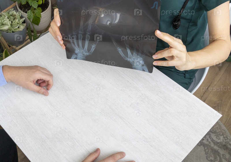 Женщина-врач изучает рентгеновскую пленку рук пациента