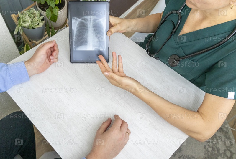 Руки женщины-врача в форме, показывающие рентгеновское изображение легких на таблетке для пациента