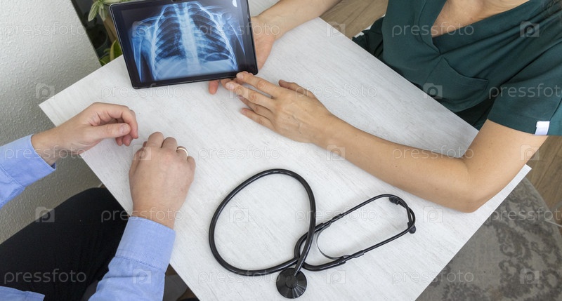 Руки женщины-врача в форме, показывающие рентгеновское изображение легких на таблетке для пациента
